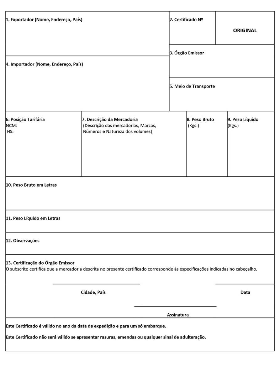 Art. 4º O Certificado de Origem será emitido conforme o seguinte modelo: